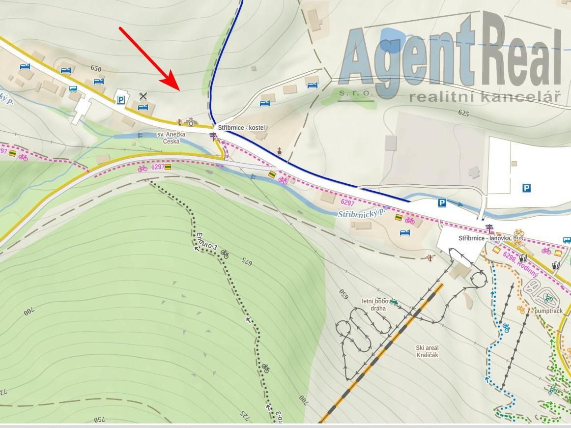 Nabízíme prodej dvou pozemků ve Stříbrnicích. Pozemky o výměře 697 m2 a 2183 m2 jsou v novém územním plánu z valné části zahrnuty k výstavbě pro rekreaci. Pozemky se nachází v centru obce blízko nástupní stanice lyžařského areálu. . Elektřina je v dosahu, předpokládá se vybudování vlastní čističky odpadních vod a studny. Přístup k pozemku s výměrou 2183 m2 je přímo z místní asfaltové komunikace, k pozemku s výměrou 697 m2 je zajištěn věcným břemenem, Blízký lyžařský areál Kraličák nabízí nejmodernější šesti sedačkovou lanovku s vyhřívanými sedačkami. Lyžařské propojení Stříbrnic a Hynčic pod Sušinou vytváří jeden velký areál s 12 sjezdovkami. V dosahu jsou lyžařské areály Paprsek, Kunčice, Branná, Dolní Morava, atd. Cena za pozemek s výměrou 697 m2 je 2.8 mil. Kč, cena za pozemek s výměrou 2183 m2 je 4,2 mil. Kč. V ceně je provize i právní služby.